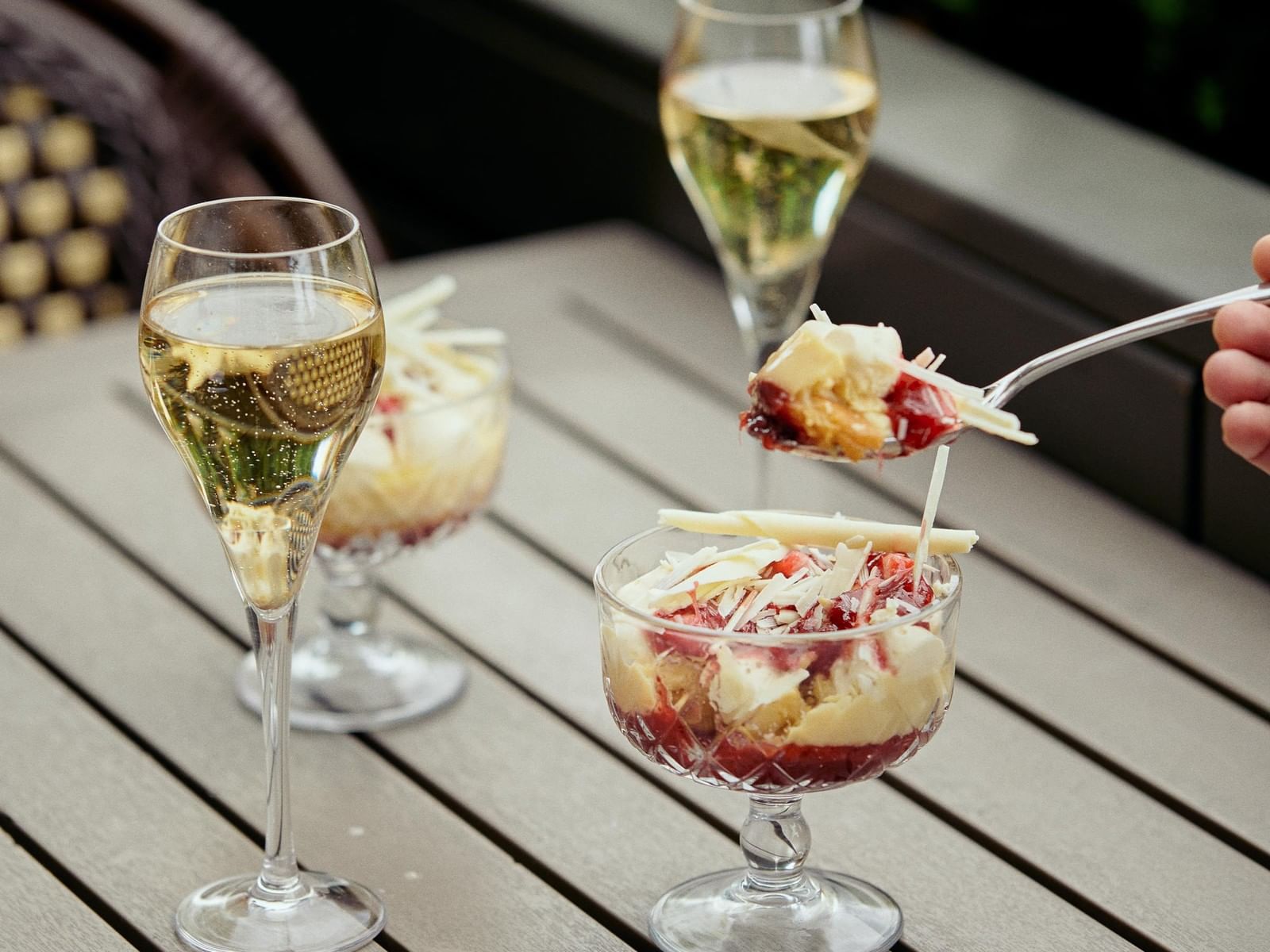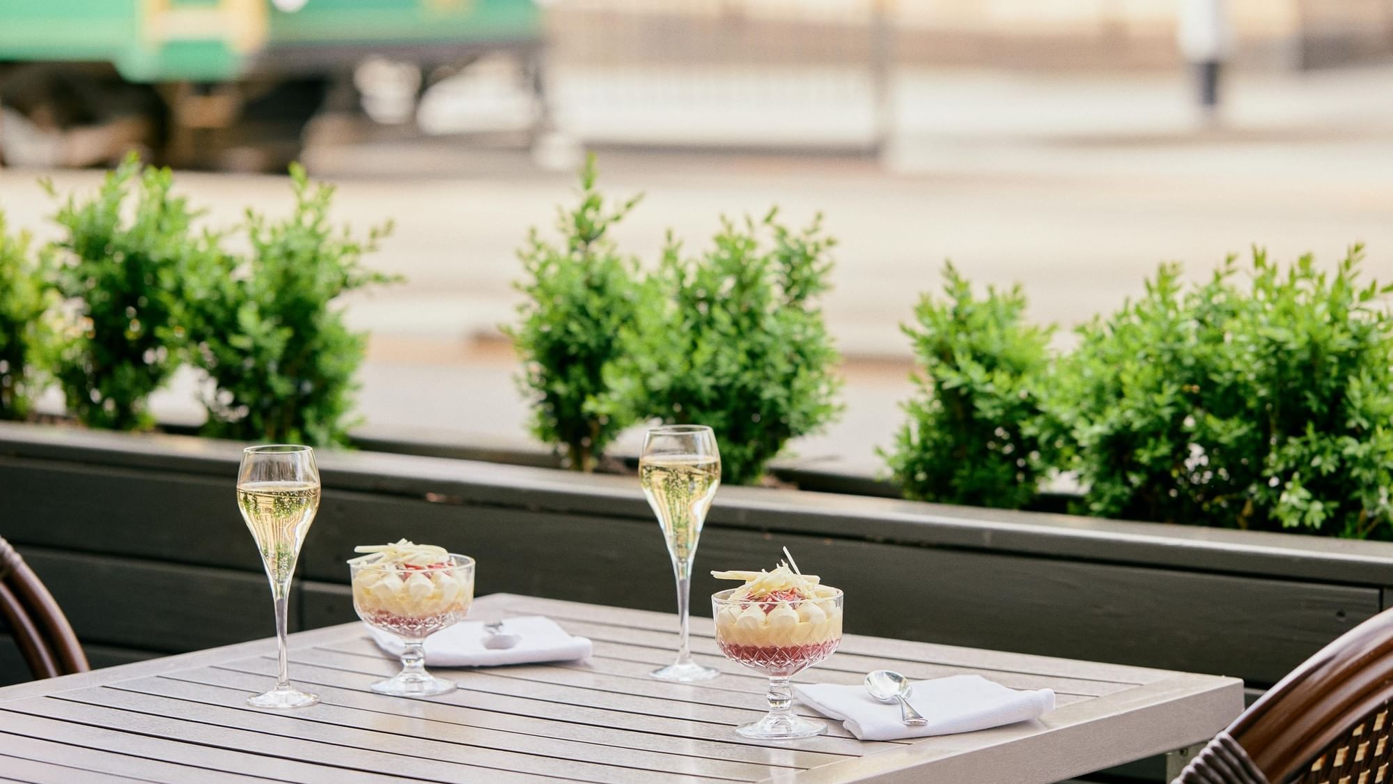 French bistro chairs. Chic green umbrellas. Leafy trees, and an iconic view of the historic trams and Parliament House. With an iconic facade and cross-walk sought by the fashionista set, we invite you to come by for A GLASS OF PIPER-HEIDSEICK CHAMPAGNE WITH OUR SEASONAL TRIFLE FOR $38. Have it alfresco in the golden glow, and capture the moment in your runway finest.